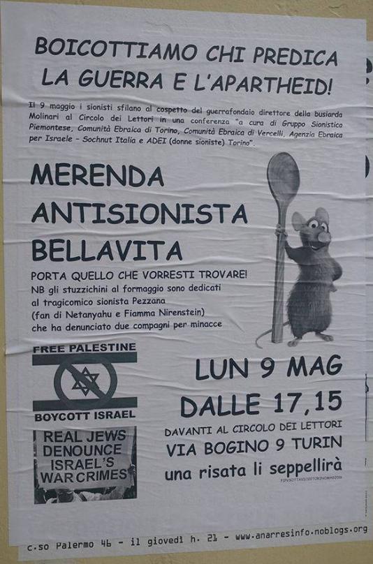 Stampa 1 Maggio 2016 Manifesti antisemiti a Torino Luogo: Torino Fonte: Testimonianza “Boicottiamo chi predica la guerra e l’apartheid” Estremisti di sinistra hanno affisso a Torino manifesti antisemiti in vari punti della città.
