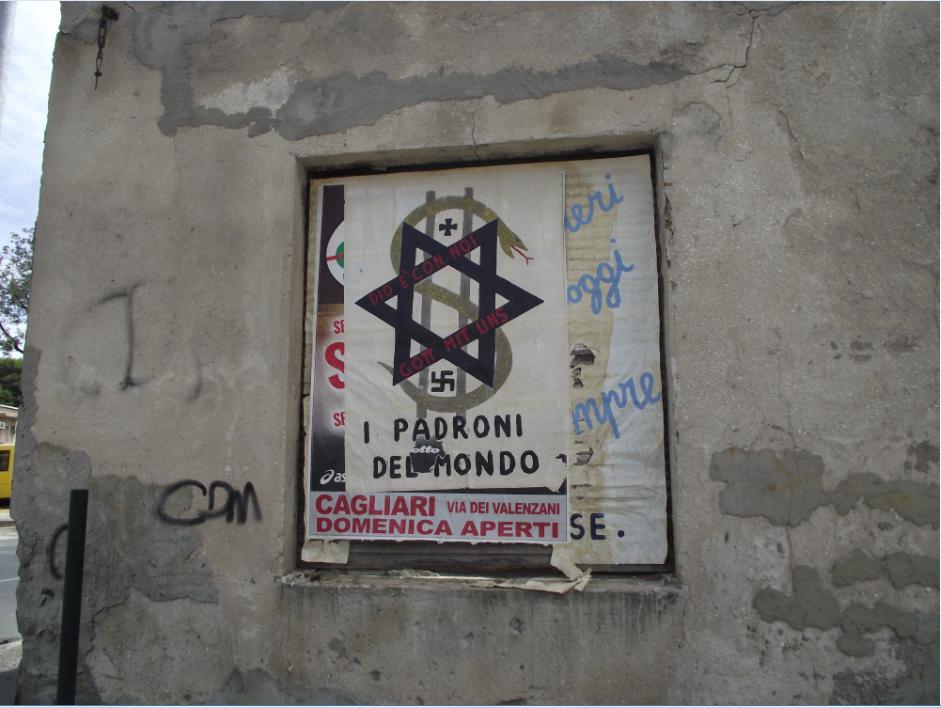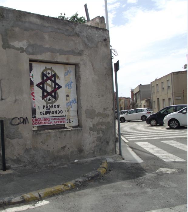 A Monserrato, comune in provincia di Cagliari, tra la via Riu Mortu e via Deroma è stato affisso un manifesto di stampo antisemita, che mostra un Maghen David sovrapposto ad serpente attorcigliato a formare il simbolo del dollaro americano al cui interno sono inscritti una svastica ed una croce di ferro, e la scritta “I padroni del mondo”.