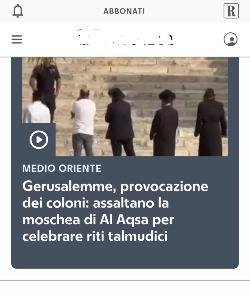 Diversi siti web di media italiani «autorevoli» pubblicano la notizia che 465 «coloni» avrebbero lanciato un assalto alla Moschea di al-Aqsa situata sulla Montagna del Tempio (a Gerusalemme ndr) «per celebrare riti talmudici». I «riti talmudici», che non esistono e sono affini a «riti satanici», costituiscono una definizione antisemita. La notizia diffusa ampiamente dai media italiani viene ripresa senza verificarla dall’agenzia palestinese Wafa. Non c’era stato alcun assalto, ma una tranquilla visita guidata di qualche decina di israeliani (non necessariamente coloni) sul Monte del Tempio, dove alcuni di loro in privato avevano recitato delle preghiere, come si vede dai filmati. Ridicola poi la cifra di 465.