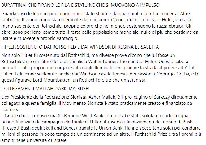 Simpatizzante no-vax posta su una chat un lungo articolo complottista e antisemita tratto da un sito web di controinformazione dietrologica. Il testo condiviso “L’inquietante impero mondiale Rothschild. Non si muove foglia che dio Rothschild non voglia” tratteggia un profilo demoniaco della famiglia Rothschild descritta come onnipotente e tentacolare, ad essa viene attribuita anche la seconda guerra mondiale, dall’avvento di Adolf Hitler alla Shoah.