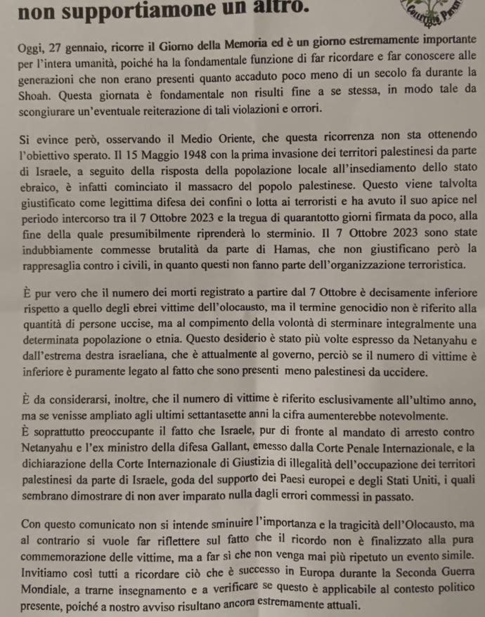 Allievi di un istituto superiore milanese appartenenti a collettivi studenteschi di sinistra, in occasione del Giorno della memoria distribuiscono un volantino intitolato “Abbiamo già vissuto un genocidio non supportiamone un altro” che demonizza il sionismo e banalizza/distorce la Shoah.