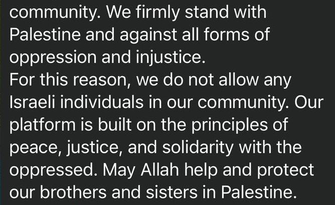 Studentessa israeliana segue un programma internazionale per l’ammissione ai corsi di medicina e si iscrive ad un corso organizzato da una società privata che offre servizi a pagamento per aiutare gli aspiranti studenti a superare il test. La società a cui si rivolge quando vede che è cittadina di Israele la rifiuta con queste parole: «We firmly stand with Palestine and against all forms of oppression and injustice. For this reason, we do not allow any Israeli individuals in our community. Our Platform is built on the principles of peace, Justice and solidarity with the oppressed. May Allah help and protect our brothers and sisters in Palestine. Ameen. Free Free Palestine».