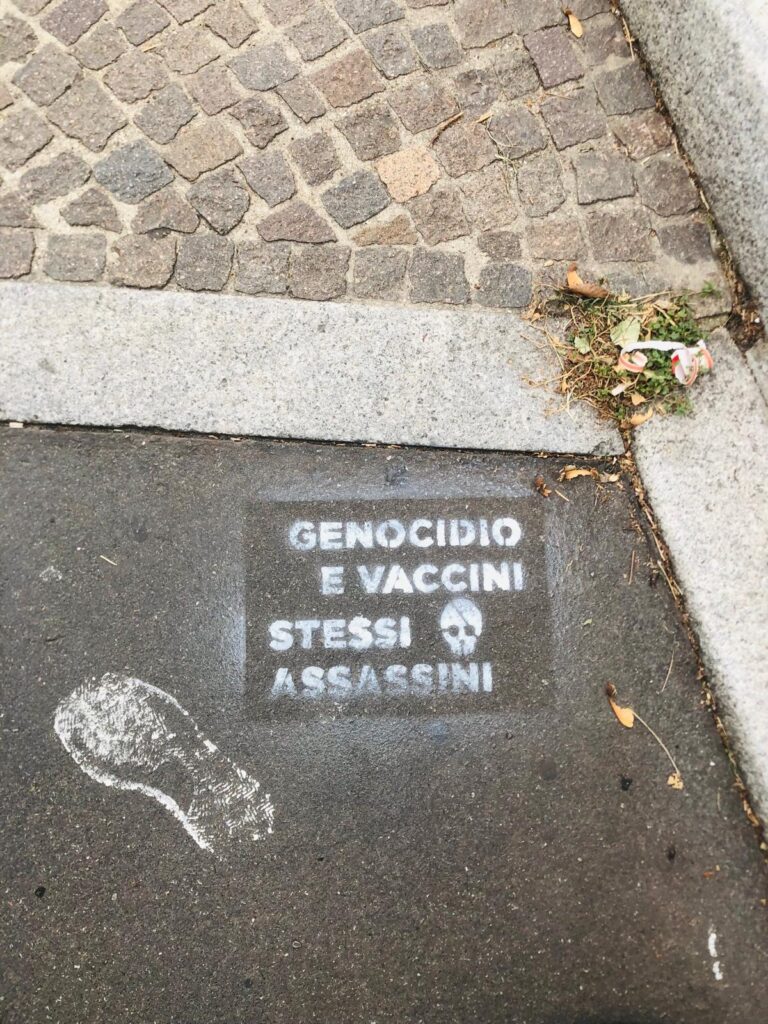 Stampa 19 Settembre 2025 Milano, graffito antisemita Luogo: Milano Fonte: Segnalazione CE “GENOCIDIO E VACCINI STESSI ASSASSINI”