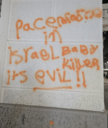 Graffito con contenuti antisemiti. L’etichetta di “baby killer” (assassino di bambini) non è solo un’accusa generica, ma rievoca uno dei più antichi, letali e persistenti stereotipi antisemiti della storia: l’accusa del sangue. L’uso della parola “evil” (malvagio) associata allo Stato di Israele ha lo scopo di demonizzarlo. C’è una profonda differenza tra il criticare duramente le politiche, le azioni militari o il governo di una nazione (un diritto legittimo) e il dipingere l’intera nazione come un’entità intrinsecamente demoniaca e malvagia in assoluto.