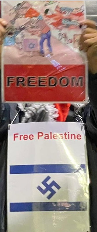Milano, corso Sempione, durante la ormai consueta manifestazione settimanale pro pal per le vie del capoluogo lombardo promossa dalle organizzazioni arabo islamiche, vengono sventolati manifesti con contenuti antisemiti, come quelli che equiparano lo Stato di Israele alla Germania nazista.