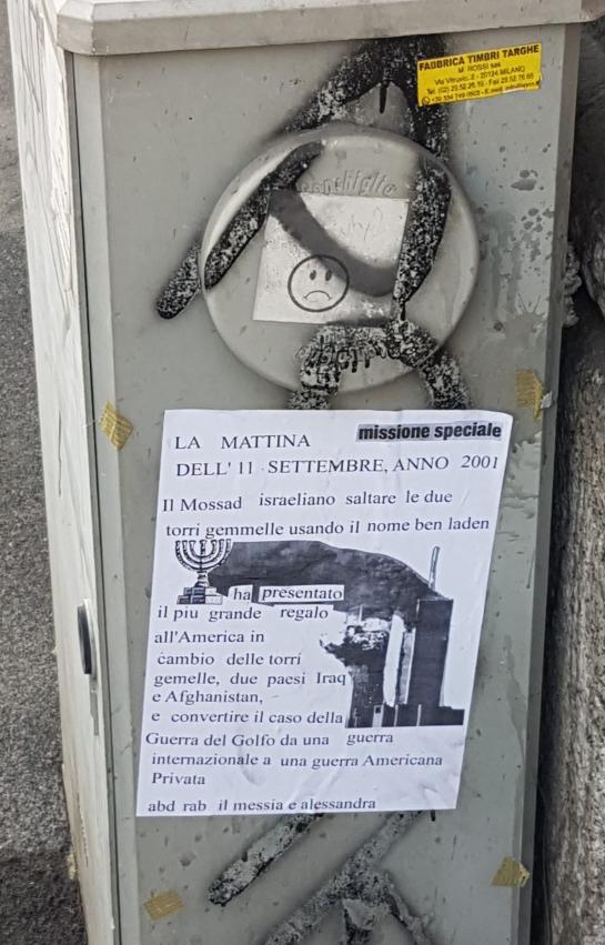 In viale Majno a Milano ed in altre zone della città, sono stati affissi poster complottisti che accusano il Mossad Israeliano di avere fatto esplodere le torri gemme di New York attribuendo poi l’azione terroristica ad Osama Bin Laden. Da alcuni anni vengono incollati in vari punti del capoluogo lombardo questi manifesti sgrammaticati e dai contenuti antisemiti e cospirativi.
