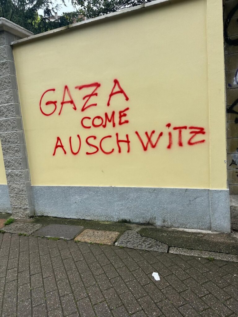 Stampa 13 Aprile 2025 Milano, scritta antisemita Luogo: Milano “Gaza come Auschwitz” Milano, Martesana, poco dopo l’incrocio con via Ponte Nuovo tracciata su un muro con vernice rossa la scritta: “Gaza come Auschwitz”.