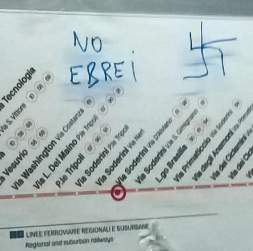 Milano. Alla fermata dell’autobus in via Soderini sul tabellone con la mappa delle fermate è stata tracciata la scritta “No ebrei” con a fianco una svastica.