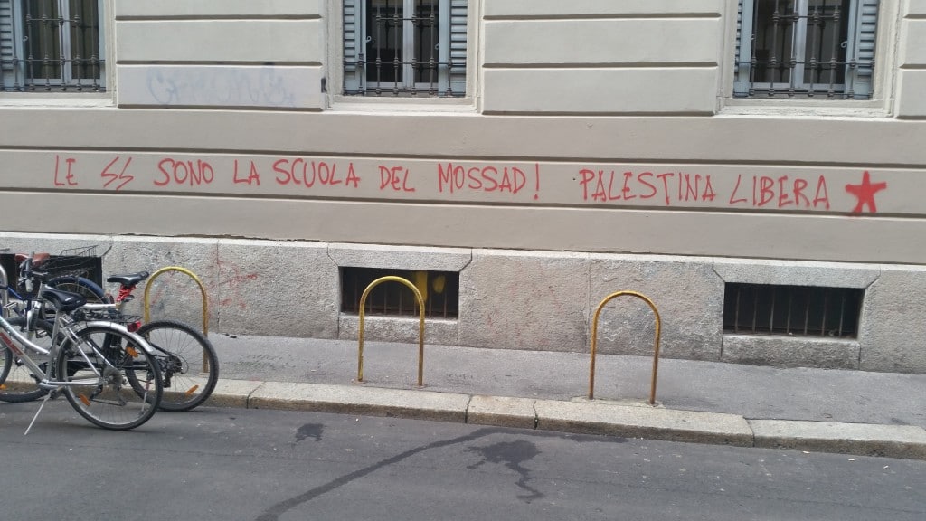 Stampa 5 Novembre 2014 Milano, scritta antisionista nei pressi dell’Università Luogo: Milano “Le SS sono la scuola del Mossad! Palestina libera” Su un muro nei pressi dell’Università Statale di Milano è stata tracciata la scritta: “Le SS sono la scuola del Mossad! Palestina libera”.