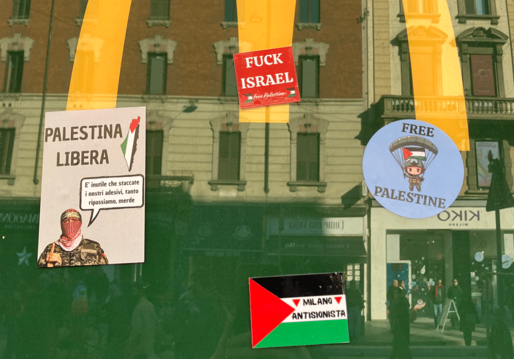 Negozio McDonald in corso Buenos Aires vandalizzato con sticker che inneggiano al terrorismo e ai massacri del 7 ottobre, con tanto di immagine del deltaplano per richiamare ai massacri, “Fuck Israel Free Palestine”, e Abu Obeida che dice: “è inutile che staccate i nostri adesivi tanto ripassiamo merde”.