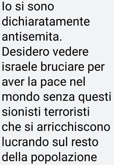 «Io sono dichiaratamente antisemita. Desidero vedere israele bruciare per aver la pace nel mondo senza questi sionisti terroristi che si arricchiscono lucrando sul resto della popolazione».