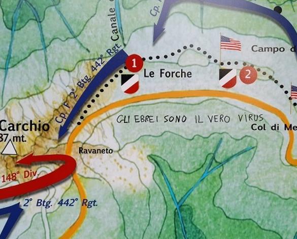 (ANSA) – MONTIGNOSO (MASSA CARRARA), 16 NOV – “Gli Ebrei sono il vero virus”: è la scritta comparsa su un cartello dedicato ai sentieri e alle trincee della Linea Gotica, recentemente ripristinati da volontari del Cai e dell’Anpi, al Pasquilio, località montana nel comune di Montignoso (Massa Carrara), in Lunigiana.