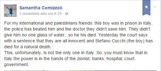 L’attivista antisionista Samantha Comizzoli il primo di novembre ha pubblicato sul suo profilo Facebook un commento dedicato alla morte di Stefano Cucchi (un giovane morto in ospedale in circostanze sospette) in cui ne imputa la morte e la mancanza di giustizia in Italia al Sionismo: