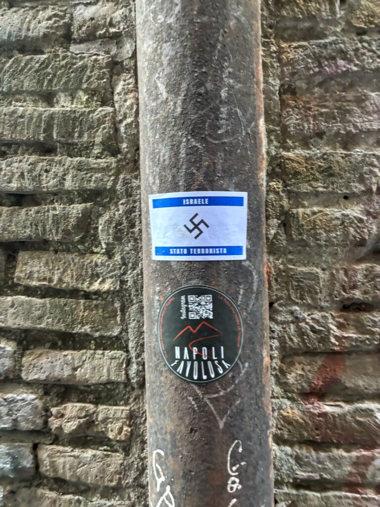 Stampa 1 Febbraio 2024 Napoli, adesivo antisemita Luogo: Napoli Fonte: Segnalazione Napoli, su un palo affisso un adesivo che equipara lo Stato di Israele alla Germania nazista.