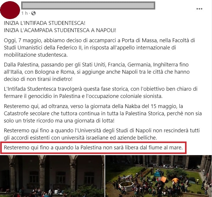 L’occupazione a Napoli porta l’Intifada studentesca nell’Università, con l’acampada, per recidere i rapporti con le Università israeliane e con un post che contiene un messaggio politico dai toni estremisti..