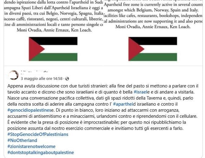 Famiglia israeliana sta pranzando in una trattoria di Napoli e parla di Israele con dei vicini di tavolo, appena la proprietaria dell’esercizio appena si rende conto della loro nazionalità li caccia con aggressività (vantandosene sui social), accusandoli di essere assassini e genocidi. La proprietaria della trattoria è un’ardente pro pal ed aderisce al BDS contro i “sionisti”.