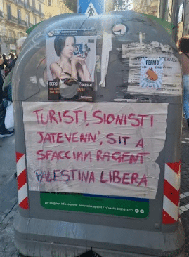 Stampa 20 Ottobre 2025 Napoli, graffito contro i turisti “sionisti” Luogo: Napoli Fonte: Segnalazione CE “Turisti sionisti Andatevene, siete un branco di stron*i Palestina libera!” Un forte e volgare messaggio di insulto in dialetto napoletano contro i “sionisti” a Napoli.