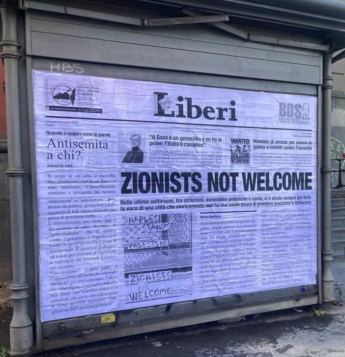 Ennesima affissione di manifesti “antisionisti” a Napoli, città che, dopo il 7 ottobre 2023, si connota per essere uno dei centri principali per la promozione di campagne “antisioniste”. In questo caso il manifesto Zionists Not Welcome si rifà alla prima pagina di un quotidiano vicino alle ragioni di Israele per farsene beffa, dandole un volto antisionista ed in favore del BDS.