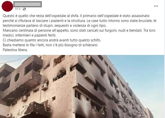 Stampa 1 Aprile 2024 Nota pagina pro Pal diffonde fake news Luogo: Facebook Fonte: Segnalazione Nota pagina di sostenitori antisionisti condivide la notizia falsa, poi smentita anche da Al Jazeera, degli stupri nell’ospedale ad opera dell’esercito israeliano.