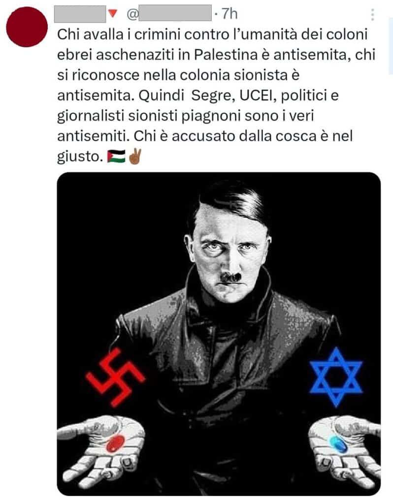Stampa 1 Settembre 2024 X, influencer pubblica post con contenuti antisemiti Luogo: X/Twitter Fonte: Segnalazione “Segre, UCEI, politici e giornalisti sionisti sono i veri antisemiti”