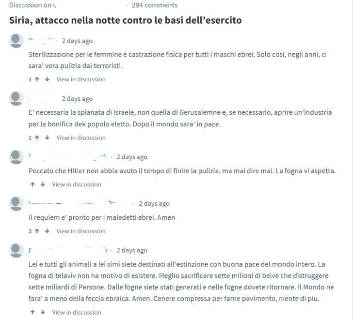 Il blog di un noto quotidiano conservatore pubblica un articolo che riferisce di un bombardamento sulle basi siriane di Hama ed Aleppo che alcune agenzie attribuiscono agli israeliani, vengono subito postati molti commenti caratterizzati da un antisemitismo brutale e rozzo, innervato dai principali topoi dell’archivio giudeofobico, qui di seguito alcuni verbatim: