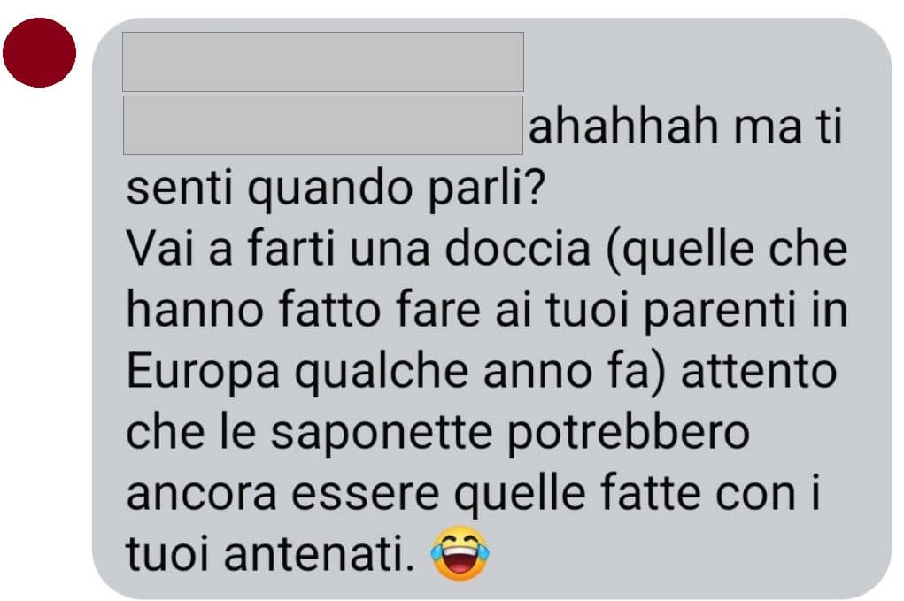 Una pagina molto seguita, che ha più di 99mila follower all’epoca dei fatti, commenta così ad un utente pro Israele: “vai a farti una doccia (quelle che hanno fatto fare ai tuoi parenti) […]. Attento che le saponette potrebbero essere ancora quelle fatte con i tuoi antenati”.