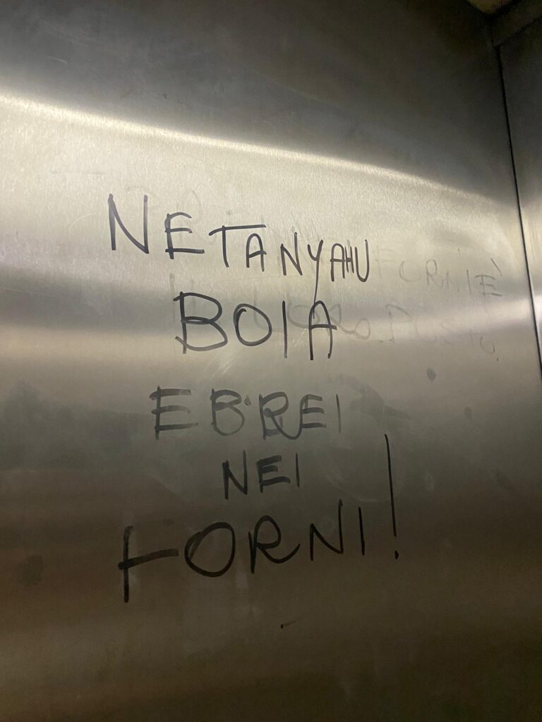 Su un ascensore di un centro commerciale Ipercoop vicino a Perugia, ignoto traccia la scritta: «Netanyahu boia Ebrei nei forni».