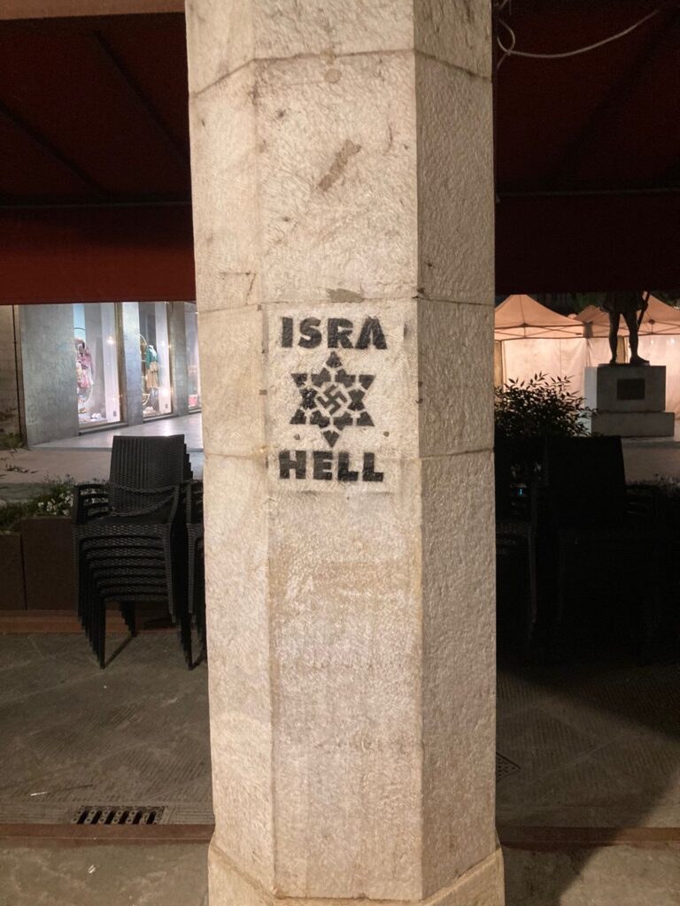 Pisa, Borgo Stretto, ignoti tracciano su una colonna la decalcomania che recita: IsraHell. Tra Isra e Hell compare un Maghen David con al centro una svastica nazista. La decalcomania compare anche in altre zone della città.