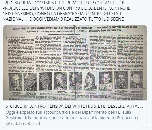 Politica di destra vicina al sovranismo etnoregionalista pubblica sul suo profilo Twitter seguito da circa 38mila persone un post dedicato al falso antisemita dei Protocolli dei savi di Sion e lo commenta dicendo che “elitari sionisti” gestirebbero il mondo.