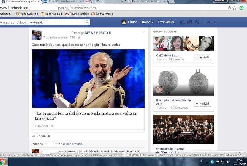 F.P. ha pubblicato sul suo profilo Facebook una fotografia del giornalista Gad Lerner corredata dal commento: «Caro naso adunco, quelli come te hanno già il futuro scritto».