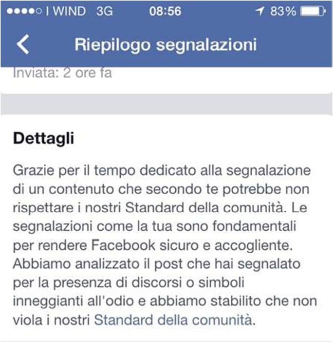 Ha allora deciso di segnalare la cosa a Facebook attraverso l’apposita funzione, indicando il fatto che il commento incitava all’odio e alla discriminazione razziale.
