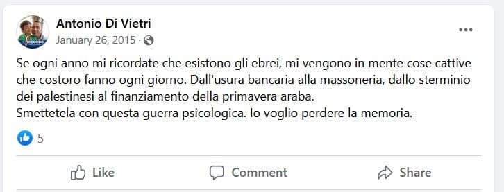 Se cercate il suo profilo su Instagram, dovete digitare «fascio1975». Su Facebook compaiono selfie con Giorgia Meloni, fiamme tricolore a gogo, il cartello di Predappio, dove riposa «uno statista, un uomo, un condottiero, un padre della patria». Non farete difficoltà a imbattervi in apologie di Benito Mussolini e Adolf Hitler, che secondo l’esponente di Fratelli d’Italia ha dato inizio «alla grande derattizzazione» contro «l’artiglio della grande usura della banca ebraica». L’autore di tutto ciò si chiama Antonio Di Vietri, segretario cittadino del partito di Meloni nel Comune di Lavello. Nel paese di 13 mila abitanti, in provincia di Potenza, il 14 e il 15 maggio si voterà per il rinnovo del Consiglio comunale. E Di Vietri è candidato nella lista a supporto di Pasquale Carnevale, anche lui di Fdi. Dal passato digitale, riemergono una serie di post antisemiti e razzisti. Come quello in cui augura il forno crematorio per gli immigrati: «Sono razzista, sono patriota, sono nazionalsocialista, sono fascista, sono nazista, sono stanco di vedere tante ingiustizie nei confronti degli italiani. Fuori dalle balle gente di merda. Infangano il nostro Bel Paese. Parassiti, pidocchioni, ladri, assassini, stupratori, ubriaconi, siete la feccia del genere umano. Un solo posto è adatto per voi ed è molto caldo». Un post che risale al 21 novembre 2014. Nel frattempo, non ha pensato di togliere la scritta «fascio» dal suo profilo di Instagram, dal quale ha pubblicato a favore di Meloni fino alle elezioni dello scorso settembre. L’elogio di Mussolini all’ingresso di Predappio, invece, è di novembre 2018. Lui oggi si giustifica, sostenendo che si tratta di post ironici scritti per rispondere con delle iperboli a chi lo accusa di essere fascista. O ancora, parla di meri «riferimenti storici». Scuse traballanti, forse è il caso di definirle imbarazzanti, alla luce dei ragionamenti che già un decennio fa Di Vietri lanciava sulla sua bacheca Facebook: «30 gennaio 1933. Ottant’anni fa Adolf Hitler diveniva cancelliere del Reich. Quella stessa sera, le sue truppe d’assalto sfilarono in parata alla luce delle torce. La Germania tornava a essere libera! In quel giorno, dalle centrali dell’Alta Banca ebraica, disseminate ovunque, si alzò un urlo di disperazione: decine di milioni di tedeschi erano state liberate dall’artiglio della Grande Usura. Da allora in poi non sarebbe stato più possibile creare moneta dalla moneta, cioè “credito” dal debito. Da allora in poi, piccoli e grandi parassiti dei lavoratori e dei pensionati tedeschi avrebbero cominciato a sciamare fuori dalla rinata Germana. Era iniziata la grande derattizzazione». Se questa è ironia…di Felice Florio