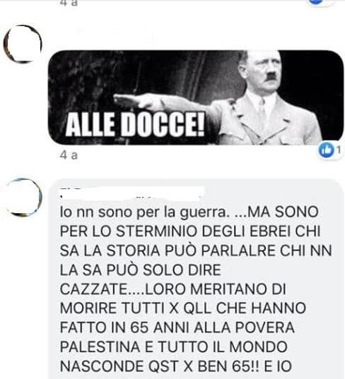 Utenti Facebook pubblicano commenti contro Israele dai toni rudemente antisemiti (es. «Gli ebrei anna muriiiii», «non sono per la guerra ma per lo sterminio degli ebrei»). Principale tema di accusa utilizzato dai partecipanti al forum, è l’equiparazione tra Nazismo e Sionismo (“sionazismo”) declinata in vari modi. Frequenti le espressioni di morte e violenza.