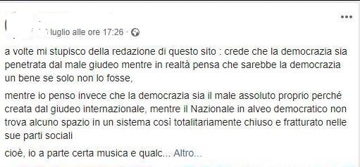 Stampa 24 Luglio 2019 Post antisemiti su Facebook Fonte: Segnalazione “la democrazia è il male assoluto creato dal giudeo internazionale” Alcuni utenti Facebook ,vicini al neonazismo ed ai movimenti neoborbonici, pubblicano e condividono commenti antisemiti, cospirativisti, negazionisti e razzisti.