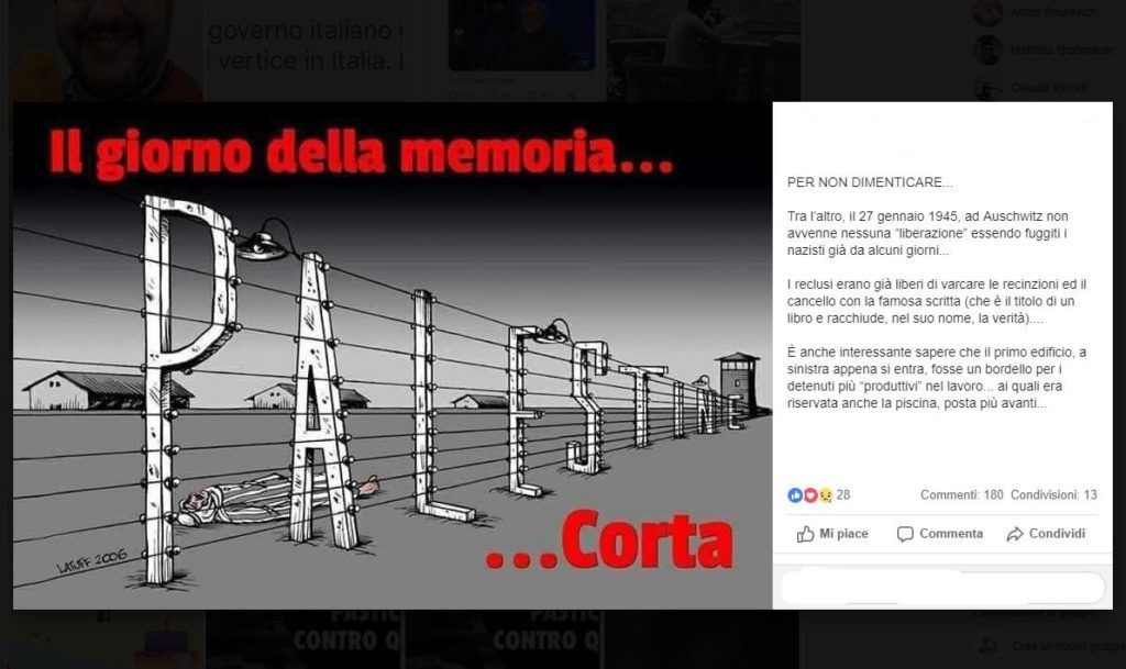 Stampa 28 Gennaio 2019 Post Facebook negazionisti e proPal Fonte: Segnalazione CE Negazionista “proPal” FPB gestisce un profilo Facebook dedicato all’attivismo filo palestinese ed antisionista, dove trovano anche ampio spazio le teorie negazioniste della Shoah.