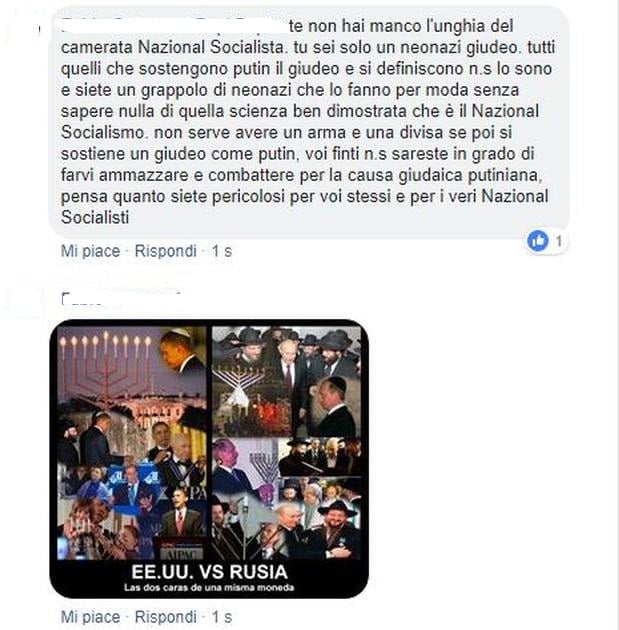 CF gestisce due (per ovviare ai blocchi periodici operati dal provider) profili Facebook personali di stampo neonazista, dove pubblica post antisemiti e discute animatamente con altri simpatizzanti neonazisti. Tra i numerosi amici Facebook di CF troviamo i principali attivisti dell’antisemitismo via social, specie di quello romano. CF esalta sempre Adolf Hitler ed il nazismo ed è ossessionato da “giudaismo” e “sionismo”, che scorge praticamente dappertutto, ha un’ottica giudeocentrica: tutto ruota intorno ad ebraismo/sionismo e tutti i personaggi più importanti sono “giudei” o “burattini dei giudei” ed impegnati in un’opera di avvelenamento del mondo. In particolare ad agosto CF ha postato molti commenti in cui accusa il presidente russo Putin di essere un “burattino giudeo-sionista” che sta islamizzando la Russia (“la Russia è un giocattolino nelle mani dei sionisti”) su ordine del NWO (Nuovo Ordine Mondiale, che nella visione di CF è una sorta di “Internazionale ebraica” volta al male). Oltre a temi caratteristici della subcultura neonazista (tra cui la negazione della Shoah) CF attinge abbondantemente all’armamentario del complottismo (es. piano Kalergi, islamizzazione della società, “immigrazionismo”, “giudaizzazione”, etc.).