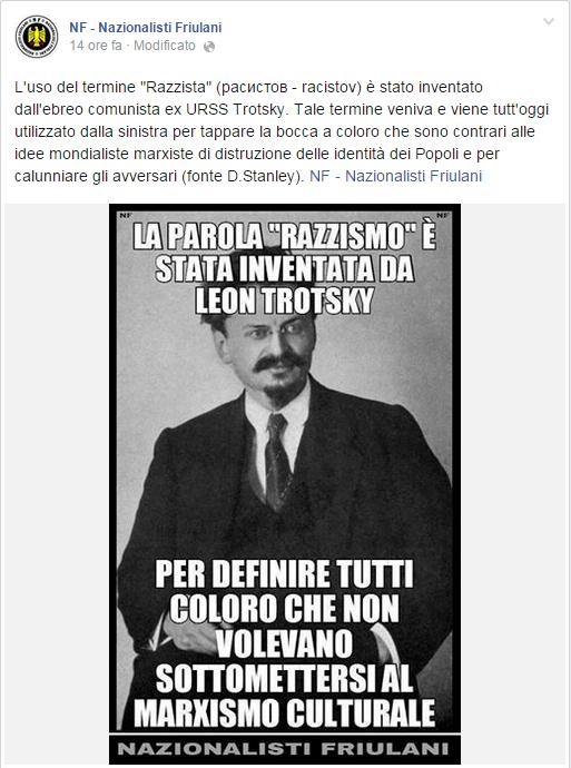 nazionalisti_friulani_post_trotsky Pubblicata il 21 Novembre 2014 alle 513 × 690 in Profilo Facebook con numerosi messaggi razzisti e antisemiti
