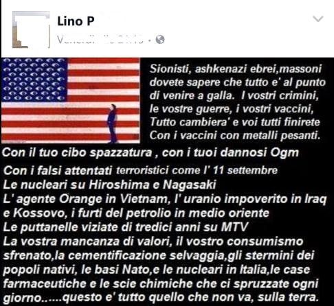 Lino P. gestisce un profilo Facebook dedicato alla pubblicazione e condivisione di post cospirativisti, tra articoli che sostengono che il cancro sia una malattia inventata dalle multinazionali del farmaco, e che i vaccini siano in realtà dannosi ed il mondo sia retto da lobby occulte di “Illuminati”, trovano spazio anche antisemitismo ed antisionismo. Ad esempio l’organizzazione terroristica islamista ISIS viene dipinta come eterodiretta dal Mossad israeliano e comandata da «ebrei sionisti», dipinti anche come i veri ed unici “padroni del mondo”.