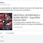 Ad esempio il 29 agosto Mario R. ha pubblicato un video “Denuncia i Rothschild e Mario Monti” tratto dal canale YouTube di matrice complottista-antisemita “Accademia della libertà per la tua sovranità”.