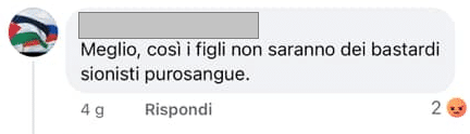 Stampa 5 Settembre 2024 Facebook, commento antisemita Luogo: Facebook Fonte: Segnalazione “meglio, così i figli non saranno dei bastardi sionisti purosangue”. Utente Facebook, così commenta la notizia dell’Huffington Post che le donne rapite e violentate da Hamas sono rimaste incinte.