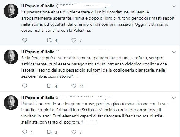 Il Popolo d’Italia si autodefinisce come la versione Twitter della “Testata storico giornalistica fondata e diretta da Benito Mussolini.”, è un profilo Twitter afferente al radicalismo di destra che usa slogan ed immagini neofascisti, fa ampio uso di peana a Benito Mussolini ed al fascismo e di insulti contro ebrei e/o sionisti, tacciati di essere: arroganti, cinici, fomentatori di odio, genocidi, presuntuosi, rancorosi, razzisti, usurai, vittimisti. Frequenti gli insulti rivolti a noti ebrei italiani quali i giornalisti Gad Lerner e David Parenzo o il deputato Emanuele Fiano.