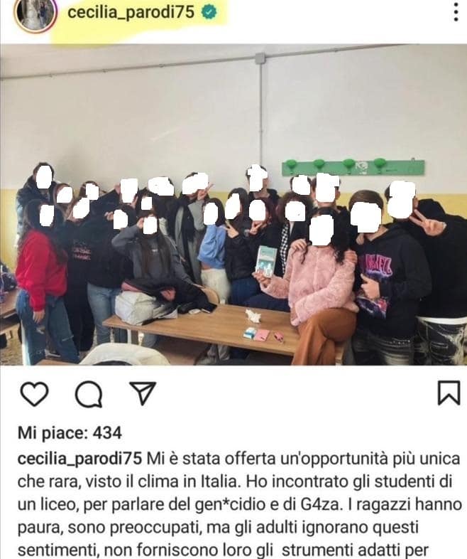 “Mi è stata offerta un’occasione più unica che rara, visto il clima in Italia. Ho incontrato gli studenti di un liceo per parlare di gen*cidio e di G4za. I ragazzi sono preoccupati. ma gli adulti non forniscono loro gli strumenti adatti per comprendere, elaborare, agire, scegliere. PARLATE con i ragazzi vi prego”.