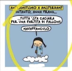 Quotidiano nazionale pubblica in prima pagina una vignetta dai contenuti antisemiti che trae spunto dalle violenze antiebraiche di Amsterdam. Il giornale pubblica abitualmente, specie dopo il 7 ottobre, disegni che propongono stereotipi antisemiti, in questo caso viene applicato lo schema ideologico che, dopo i massacri di Hamas e la reazione dello Stato di Israele è diventato usuale, ovvero l’appropriazione di simboli della Shoah che vengono usati contro gli ebrei.