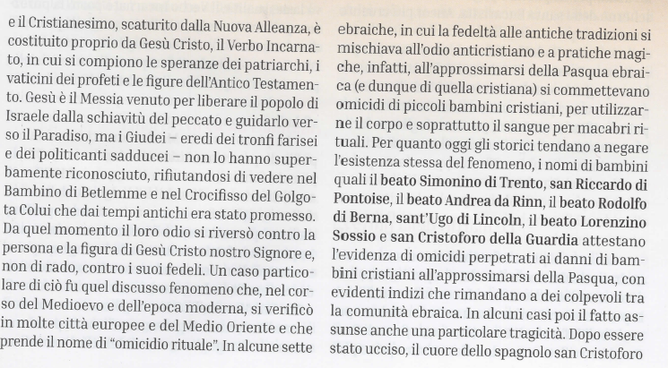 Rivista cattolica-tradizionalista dedicata ad un santo italiano venerato da milioni di fedeli, nel numero speciale dedicato al Natale pubblica un articolo che accusa gli ebrei di praticare omicidi rituali di non ebrei per scopi magico medicamentosi.