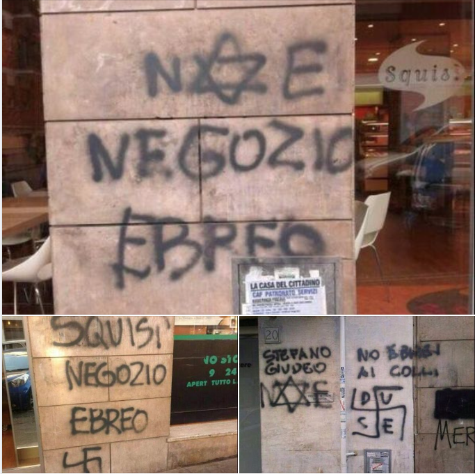Gravi scritte antisemite e insulti, accompagnati da svastiche, sono state tracciate sui muri di fronte al negozio Squisi, zona Colli Portuensi di Roma: “Squisi negozio ebreo”, “No ebrei sui colli”.