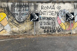 “NO JUDE ZONE” “UCCIDERE UN COLONO NON è REATO” “IL MONDO VI SCHIFA MALEDETTI EBREI” “ROMA ANTISEMITA” “MORTE AGLI EBREI” “MELONI PUTT***A SIONISTA”