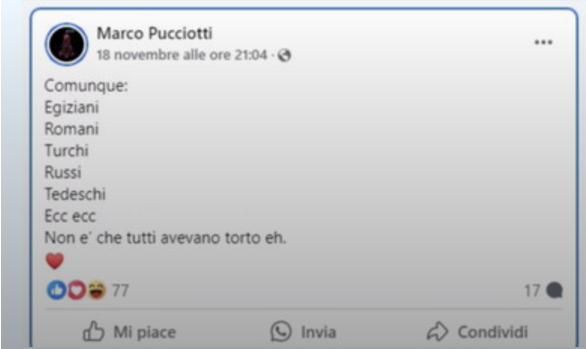 Marco Pucciotti, “i tedeschi non avevano torto”: il post della vergogna sugli ebrei