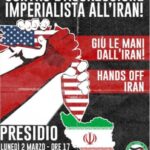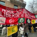 Nel corso della manifestazione di sostegno all’Iran «Contro l’aggressione imperialista all’Iran» promossa da organizzazioni e movimenti islamisti, tra i vari materiali di propaganda pro pal, pro ayatollah ed antisemita (es. accuse contro l”élite di Esptein”) esposti spicca uno striscione che alla base riporta i loghi di vari gruppi terroristici tra cui uno che riporta in lingua araba la «maledizione sugli ebrei».
