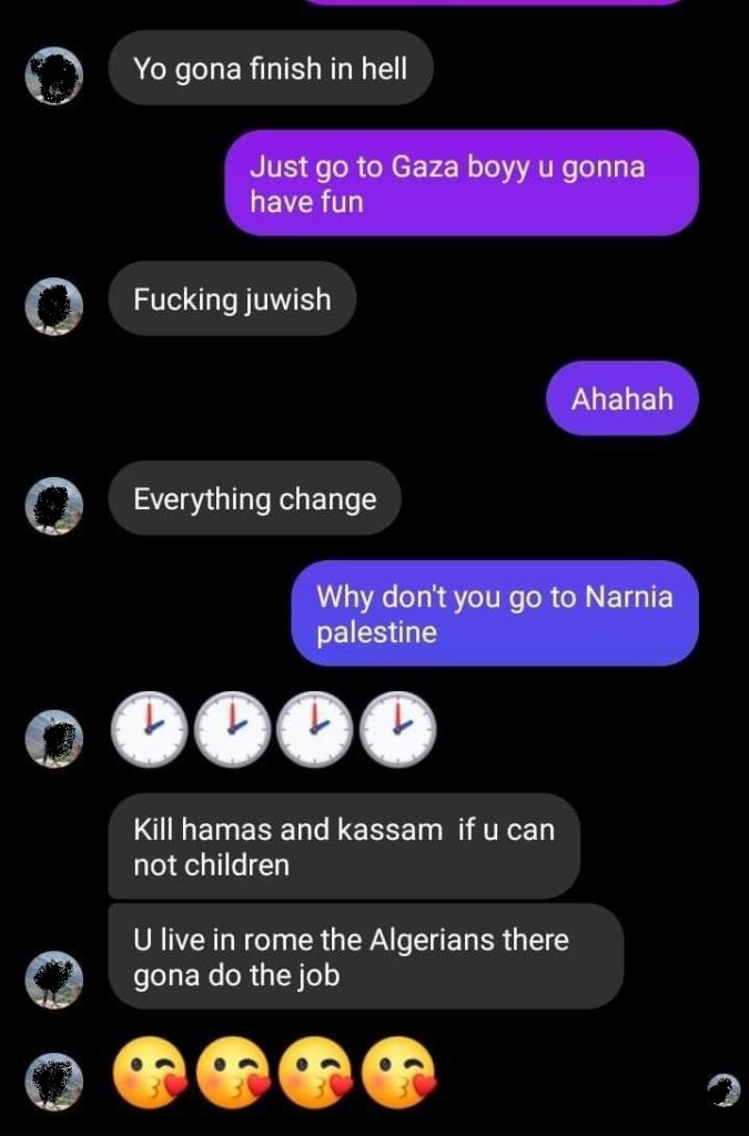 Stampa 18 Ottobre 2023 Facebook, messaggi con toni minatori Luogo: Roma Fonte: Segnalazione CE “fucking juwish” Un ragazzo riceve messaggi Facebook con toni minatori: “Islam will win my friend” “fucking juwish” “U live in Rome the Algerians there gona do the job”.