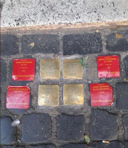 Roma, Trastevere, piazza San Cosimato, ignoti pongono delle pietre di inciampo rosse in chiave pro pal a fianco di quelle che ricordano gli ebrei deportati e uccisi nel campo di sterminio di Auschwitz.